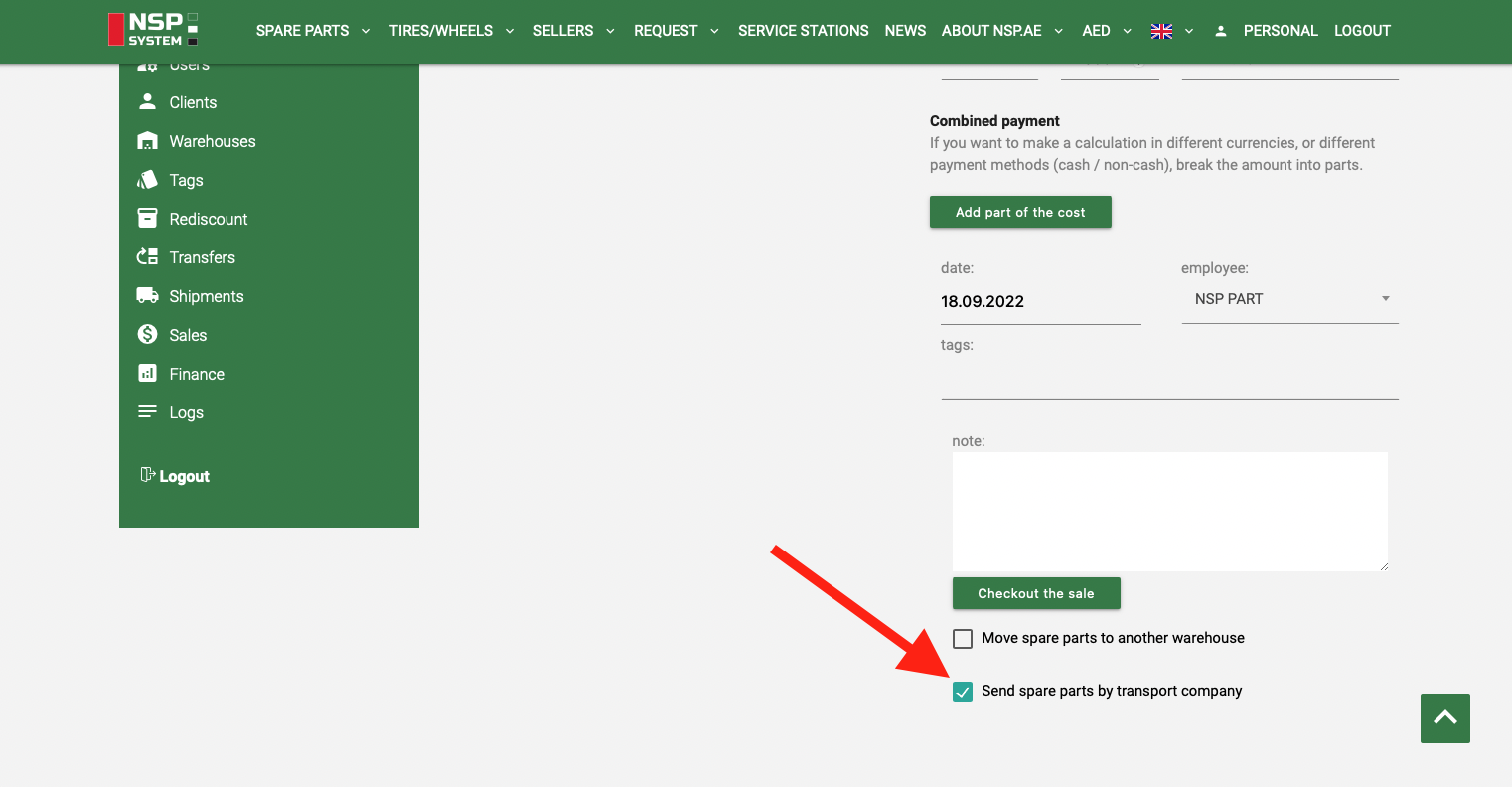 In order to create a shipment, you first need to arrange the sale of goods through the system. You can use the debt sale functionality if the customer pays for the goods by cash on delivery. The shipment can be created automatically immediately during the registration of the sale, to do this, turn on the "Send spare part by transport company" checkbox next to the "Checkout thesale" button during the sale process.