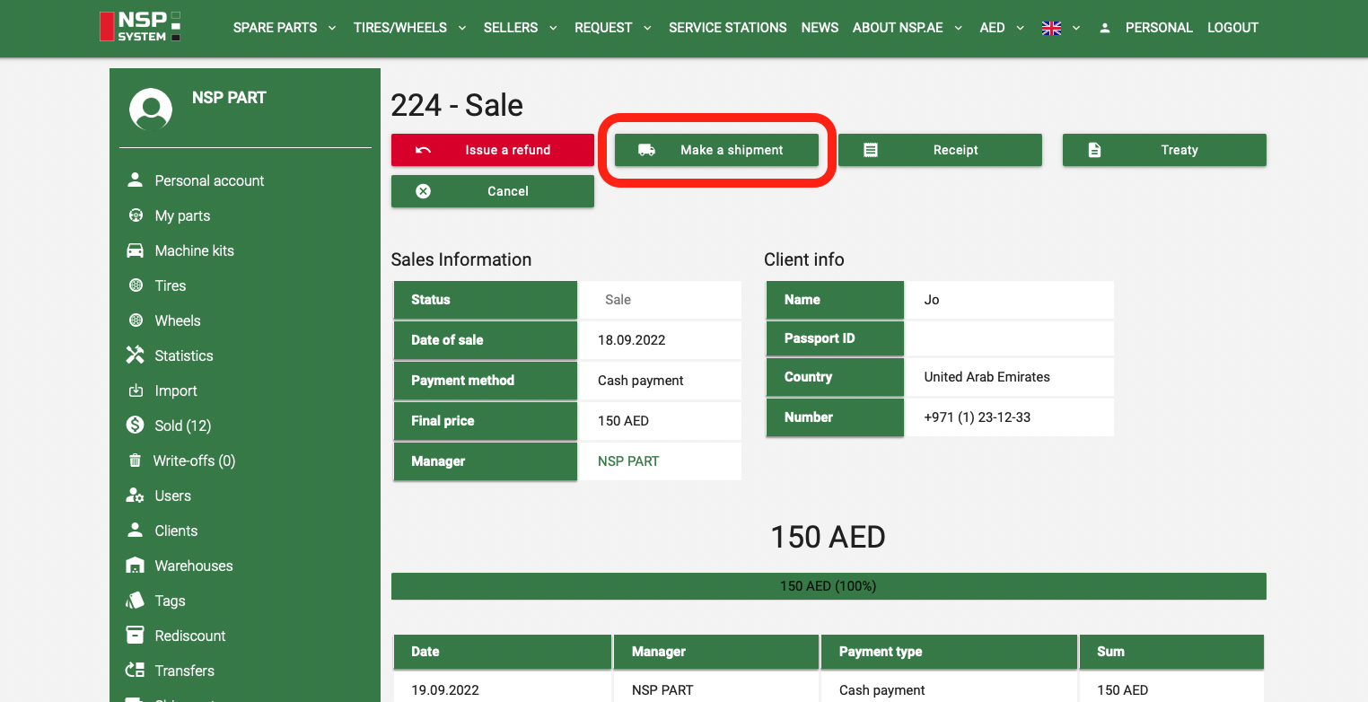 You can also create a shipment both after registration of the sale and during its creation, for this you need to go to the desired sale and click the "Make a shipment" button.